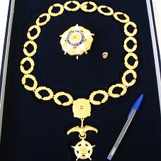 ORDEM DO MÉRITO DO CHILE, NO GRAU DE GRÃ COLAR, COMPOSTO POR: UM GRÃ COLAR EM METAL DOURADO, CORDÃO EM RAMOS COM BRASÃO DO CHILE NO CENTRO E INSÍGNIA COM UMA ÁGUIA E UMA ESTRELA BRANCA COM ROSTO DE UMA MULHER INSCRITO NELA E 'REPUBLICA DE CHILE' (ANVERSO) E 'AL MERITO' (REVERSO); UM PLACA COM MESMA ESTRELA E BRASÃO E 'ORDEN AL MERITO / CHILE'; E UM BÓTON, COM O BRASÃO FIXADO EM FITA AZUL E DOURADA. ACONDICIONADOS EM CAIXA AZUL MARINHO (34X45X6,5 CM).