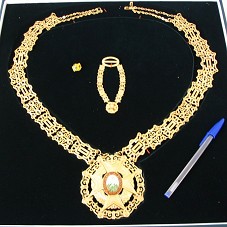 ORDEM NACIONAL DO MÉRITO, NO GRAU DE GRÃ COLAR, COMPOSTA POR: UM GRÃ COLAR EM METAL DOURADO,COM INSÍGNIA DE UMA CRUZ DOURADA, SEMELHANTE À CRUZ DE MALTA, COM DESENHO DE MONTANHAS NO CENTRO E 'REPUBLICA DEL ECUADOR / AL MERITO'; UMA MINIATURA DO GRÃ COLAR; E UM BÓTON, EM FITA AMARELA COM DETALHES VERMELHO, AZUL E DOURADO. ACONDICIONADOS EM CAIXA VERDE (41X41X6 CM).