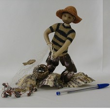 OBJETO ARTESANAL (19,5X19,5 CM), NA FORMA DE UM PESCADOR TRAJANDO CAMISETA COM LISTRAS, CHAPÉU E CALÇA FEITA DE CONCHAS. EM SUAS MÃOS UMA REDE DE PESCAR E PRÓXIMO AOS SEUS PÉS UMA CESTA COM UM PEIXE. A BASE FEITA DE CONCHAS, COM A INSCRIÇÃO 'AURÉLIA ALÍCIA / RIBEIRÃO DA ILHA / FPOLIS - SC / (48) 337-5495', EM SEU INTERIOR. ACOMPANHA DOIS CARTÕES DE VISITA 'CIA DAS OSTRAS' E 'ARTESANATO EM CONCHAS'.