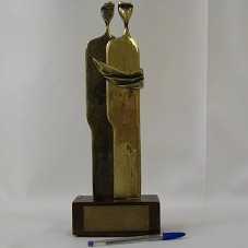 TROFÉU (13X8,3X36 CM), EM METAL DOURADO, REPRESENTANDO DUAS PESSOAS EM PÉ, UMA ABRAÇANDO A OUTRA COM UM BRAÇO. A BASE EM MADEIRA, COM UMA PLACA EM METAL COM A INSCRIÇÃO 'AO PRESIDENTE LUIS INACIO LULA DA SILVA / UMA HOMENAGEM DO TEVAH PELA CRIAÇÃO DA SEMANA NACIONAL DA CIDADANIA E SOLIDARIEDADE. / AGOSTO 2004. NA PARTE DE CIMA DA BASE UMA PLACA PEQUENA COM A INSCRIÇÃO 'ANA SIMONE' E NA PARTE INFERIOR UMA ETIQUETA 'TROFÉU CRIADO POR ANA SIMONE KEISERMAN LEMPKE / ARTISTA PLÁSTICA GRADUADA PELA UFRGS, EM 1982. DEDICA-SE A TROFÉUS, OBJETOS EM METAL E PEÇAS ESPECIAIS. SEU CURRÍCULO ENCONTRA-SE À DISPOSIÇÃO PELOS FONES (51) 9113.1415 / 3337.7579'.