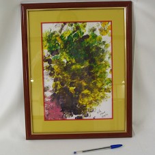 QUADRO (33,5X42 CM) COM MOLDURA EM MADEIRA MARROM COM DETALHES DOURADOS, PASSE-PARTOUT AMARELO COM DETALHES VERMELHOS E TAMPO DE VIDRO. PINTURA ABSTRATA, FEITA COM AS PONTAS DOS DEDOS, PREVALECENDO AS CORES VERDE, AMARELA, ROXA E ROSA. NA PARTE INFERIOR DIREITA, ASSINATURA DO ARTISTA, 'TILA / 69 ANOS / 07/06/02'. ATRÁS A INSCRIÇÃO 'ARTE DOS PINTORES DA CASA LAR DO CEGO IDOSO / PORTO ALEGRE - F. 51 3344-1804.'.
