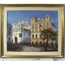 PINTURA A ÓLEO SOBRE TELA (80X100 CM). PAISAGEM DE UMA RUA DA CIDADE DE QUITO, COM EDIFÍCIOS NAS CORES ROSA E BRANCO, PESSOAS CAMINHANDO, UMA ÁRVORE FLORIDA E O CÉU AZUL COM ALGUMAS NUVENS . NO CANTO INFERIOR DIREITO, ASSINATURA DO ARTISTA 'RONQUILLO'. MOLDURA (124X104 CM) EM MADEIRA LAMINADA DE DOURADO, E PASSE-PARTOUT CREME COM FRISO DOURADO. ACOMPANHA CURRICULUM DO ARTISTA, UM CERTIFICADO DE AUTENTICIDADE DA PINTURA E UM CARTÃO DO PRESIDENTE DO EQUADOR COM A INSCRIÇÃO 'LUCIO E. GUTIÉRREZ BORBUA / PRESIDENTE CONSTITUCIONAL DE LA REPÚBLICA DEL ECUADOR'.