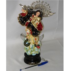 IMAGEM DE NOSSA SENHORA DE QUITO (27,5 CM), COM ASAS E COROA EM METAL PRATEADO, FIXADA EM BASE CIRCULAR DE MADEIRA (9X4 CM). AS ASAS, A COROA E AS MÃOS SÃO SOLTAS DA PEÇA, QUE POSSUI ORIFÍCIOS PARA FIXÁ-LAS. ACOMPANHA UM CORDÃO EM METAL PRATEADO. ACONDICIONADA EM CAIXA DE MADEIRA (32X15X14 CM), COM TAMPA DESENHADA EM DOURADO E CORPO TRABALHADO.