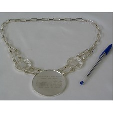 MEDALHA GENERAL ELOY ALFARO DELGADO, EM METAL PRATEADO, PRESA À CORRENTE CONTENDO DOIS CÍRCULOS COM DESENHOS DE ESTRELAS INSCRITOS. NO ANVERSO DA MEDALHA, 'CONGRESO NACIONAL DE LA REPÚBLICA DEL ECUADOR / GENERAL ELOY ALFARO / AL EXCELENTÍSSIMO SEÑOR DON LUIS INÁCIO LULA DA SILVA / PRESIDENTE DE LA REPÚBLICA FEDERATIVA DEL BRASIL / QUITO AGOSTO DEL 2004'; NO REVERSO, SÍMBOLO DA MESMA ESTRELA. ACONDICIONADA EM CAIXA DE VELUDO AZUL MARINHO (38X38X4 CM).