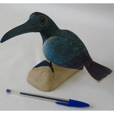 ESCULTURA EM FORMA DE PÁSSARO (15X16X13 CM), EM MADEIRA, PREDOMINANDO TONS DE VERDE E AZUL. OS PÉS SÃO PINTADOS NA BASE, ONDE O PÁSSARO ESTÁ FIXADO.