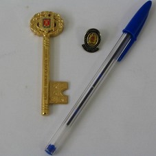 CHAVE DA CIDADE DE QUITO (9 CM) EM METAL DOURADO. POSSUI O DESENHO DO BRASÃO DA CIDADE E A INSCRIÇÃO 'ILUSTRE MUNICIPALIDADE DE QUITO'. UM BÓTON (2X1,5 CM), COM DESENHO DO BRASÃO DA CIDADE E A INSCRIÇÃO 'DISTRITO METROPOLITANO DE QUITO / ALCALDIA / VISITANTE ILUSTRE'. ACONDICIONADOS EM ESTOJO DE VELUDO AZUL (6,5X12,5X3 CM).