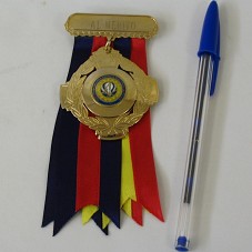 MEDALHA EM METAL DOURADO, COM BARRETA DOURADA E INSCRIÇÃO 'AL MERITO'. POSSUI PRESA À BARRETA, FITAS AZUL E VERMELHA E AMARELA E VERMELHA. NO ANVERSO DA MEDALHA, 'ASO. TRABAJADORES EMPRESA ELECTRICA QUITO S.A' E SÍMBOLO DA MESMA; NO REVERSO, 'AL PRESIDENTE LULA / ECUADOR 25-08-04'. ACONDICIOANADA EM ESTOJO DE VELUDO AZUL MARINHO (9X9X3 CM).