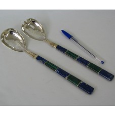 DUAS PEÇAS DE ARTESANATO TRADICIONAL CHILENO: DUAS COLHERES (27,5 CM CADA) EM PRATA 925, COM CABOS EM LAPISLAZULI E MALAQUITA. ACOMPANHA INFORMATIVO SOBRE AS PEÇAS, EM ESPANHOL E INGLÊS E UM CARTÃO COM A INSCRIÇÃO 'LUISA DURAN DE LAGOS / SRA.DEL PRESIDENTE DE LA REPUBLICA'. ACONDICIONADAS EM ESTOJO (16X33X4 CM) NA COR OCRE, COM CINTA DE PAPEL 'FRAGMENTOS DE CHILE'.