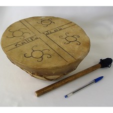 TAMBOR (26,5X11,5 CM) EM FORMA DE TRONCO DE CONE, EM MADEIRA, COM TAMPO EM COURO. NO TAMPO, 'KALLFU WENU'. E NO FUNDO DA BASE, 'RECUERDO COMUNIDADES MAPUCHE DE LA GRANJA 24-08-2004'. ACOMPANHA BAQUETA (30 CM).