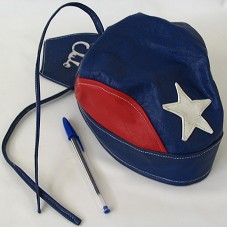 BANDANA EM COURO, NAS CORES DA BANDEIRA DO CHILE COM UMA ESTRELA NO CENTRO. ATRÁS, 'CHILE'. COSTURADA FORMANDO UM BONÉ.