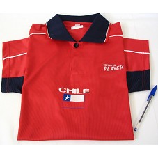 CAMISETA EM POLIAMIDA VERMELHA, DE MANGA CURTA, COM DETALHES EM AZUL. NA FRENTE, A BANDEIRA DO CHILE E 'CHILE / DEPORTES PLAYER'.