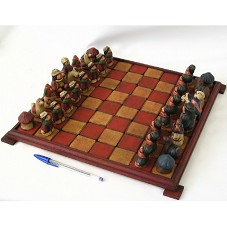 JOGO DE XADREZ, COMPOSTO DE TABULEIRO (36X36 CM), COM CASAS ALTERNADAS EM BEGE E VINHO E 32 PEÇAS MODELADAS EM ARGILA, DEZESSEIS NA COR VINHO E DEZESSEIS NA COR AZUL. ACOMPANHA CARTÃO COM A INSCRIÇÃO 'REPÚBLICA DEL ECUADOR / CONGRESO NACIONAL / GUILLERMO LANDÁZURI CARRILLO / PRESIDENTE'. ACONDICIONADO EM CAIXA DE PAPELÃO (41X41X5 CM).