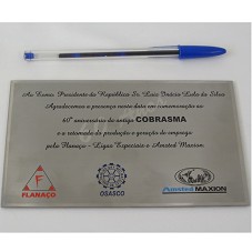 PLACA (16X10 CM) EM AÇO ESCOVADO COM BORDAS POLIDAS. POSSUI A GRAVAÇÃO 'AO EXMO. PRESIDENTE DA REPÚBLICA SR. LUIZ INÁCIO LULA DA SILVA / AGRADECEMOS A PRESENÇA NESTA DATA EM COMEMORAÇÃO AO 60º ANIVERSÁRIO DA ANTIGA COBRASMA E A RETOMADA DA PRODUÇÃO E GERAÇÃO DE EMPREGO PELA FLANAÇO - LIGAS ESPECIAIS E AMSTED MAXION.'. POSSUI LOGOMARCAS DA 'FLANAÇO' , 'AMSTED MAXION' E 'SIND. TRAB. IND. MET. MEC. M.A.T. ELET. DE OSASCO'. ACONDICIONADA EM CAIXA (20X14X3 CM) DE VELUDO AZUL MARINHO.