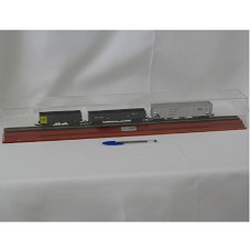 MINIATURA DE VAGÕES DE TREM ENCARRILHADOS EM TRILHO FERROVIÁRIO (49X3,5X4,5 CM). POSSUI A INSCRIÇÃO 'MRS GDT / GFE EFVM / FERRONORTE'. FIXADO EM BASE DE MADEIRA (70X9,5 CM) E COM REDOMA DE ACRÍLICO.