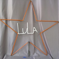 ESCULTURA EM FERRO (103X103 CM) EM FORMATO DE UMA ESTRELA LARANJA, COM A INSCRIÇÃO 'LULA' NA PARTE DE DENTRO, EM BRANCO. POSSUI CABO EM FERRO NA BASE, COM LUGAR PARA FIXAÇÃO.