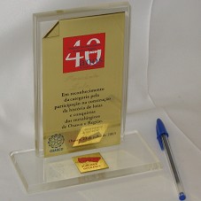 PLACA (8,5X16 CM) EM METAL DOURADO,COM UMA DAS PONTAS DOBRADA. POSSUI A INSCRIÇÃO 'SINDICATO DOS METALÚRGICOS DE OSASCO E REGIÃO / 40 ANOS DE LUTAS E CONQUISTAS / PRESIDENTE LULA / EM RECONHECIMENTO DA CATEGORIA PELA PARTICIPAÇÃO NA CONSTRUÇÃO DA HISTÓRIA DE LUTAS E CONQUISTAS DOS METALÚRGICOS DE OSASCO E REGIÃO. OSASCO, 23 DE JULHO DE 2003'. FIXADA EM ACRÍLICO (10X46,5 CM) E ESTE EM BASE (15X7X1 CM) DE MESMO MATERIAL.