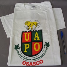 CAMISETA (TAM G) EM MALHA BRANCA, DE MANGA CURTA. NA FRENTE, ESTAMPA EM VERMELHO, VERDE, AMARELO E PRETO, BRASÃO DA 'UAPO / UNIÃO DOS APOSENTADOS E PENSIONISTAS DE OSASCO / OSASCO'.