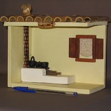 MINIATURA DE COZINHA (20X11X19,5 CM), ABERTA NA PARTE FRONTAL, MOSTRANDO FOGÃO À LENHA, COM PANELAS PRETAS NO TAMPO. POSSUI JANELA EM MADEIRA, COM CORTINA EM CROCHÊ; TELHADO EM BAMBU, IMITANDO TELHAS COLONIAIS. NA FRENTE, 'GONÇALVES MG'. POSSUI DOIS GANCHOS NA PARTE POSTERIOR, PARA COLOCAÇÃO EM PAREDE.
