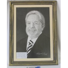 RETRATO DO PRESIDENTE LULA (39X59 CM) EM GRAFITE, PREDOMINANDO TONS DE PRETO. NO CANTO INFERIOR ESQUERDO, PAPEL BRANCO COM A INSCRIÇÃO 'AO PRESIDENTE LULA COM OS AGRADECIMENTOS DA CIDADE DE SERRANA E DO PREFEITO COMPANHEIRO VALÉRIO GALANTE / SERRANA-SP 07/09/2004'. NO CANTO INFERIOR DIREITO, ASSINATURA DO ARTISTA (ILEGÍVEL). MOLDURA (55,5X75 CM) EM MADEIRA CINZA, PATINADA DE DOURADO, E PASSE-PARTOUT BEGE.