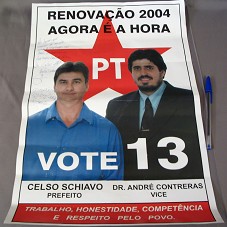 CARTAZ (32,5X47,5 CM) DE PROPAGANDA POLÍTICA, CAMPANHA PARA PREFEITO. POSSUI FOTO DE 'CELSO SCHIAVO / PREFEITO / DR. ANDRÉ CONTRERAS / VICE' E A INSCRIÇÃO 'RENOVAÇÃO 2004 / AGORA É A HORA / PT / VOTE 13 / TRABALHO, HONESTIDADE, COMPETÊNCIA E RESPEITO PELO POVO.' E, AINDA, MANUSCRITO 'AO HOMEM QUE MOSTROU AO MUNDO COMO SE CONSTROIR UM PAÍS DEMOCRÁTICO. LUIZ INÁCIO LULA DA SILVA / DE: CELSO E ANDRÉ CONTRERAS / GUAPIAÇU / 09/09/2004 / SÃO PAULO'.