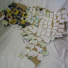 CARTAZ (200X200 CM) EM PAPEL CRAFT, NO FORMATO DO MAPA DO BRASIL. POSSUI DIVERSAS COLAGENS, ENTRE RECORTES DE REVISTAS E REDAÇÕES DOS ALUNOS DO COLÉGIO IDEAL.