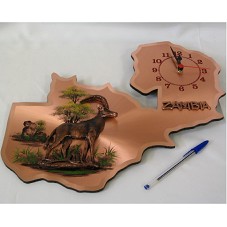 RELÓGIO DE PAREDE (45x26 CM) NO FORMATO DO MAPA DA ZÂMBIA, EM MADEIRA COM ACABAMENTO EM METAL COBREADO ESCOVADO E BORDAS POLIDAS, NA EXTREMIDADE ESQUERDA, UM ANTÍLOPE EM ALTO RELEVO, COM UMA PAISAGEM PINTADA NO FUNDO. NA OUTRA EXTREMIDADE, RELÓGIO ANALÓGICO E 'ZAMBIA'.