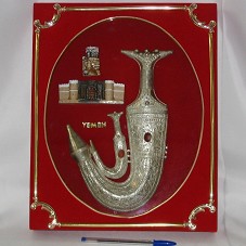 ADAGA CURVA EM PRATA, A JAMBIYA, SIMBÓLICA DO IEMEN, EM BAINHA DE MESMO MATERIAL, COM DETALHES EM PEDRA ÂMBAR. FIXA EM MOLDURA-CAIXA (30X37X4,5 CM) FORRADA DE VELUDO VERMELHO, COM DETALHES DOURADOS E TAMPO DE VIDRO. DO SEU LADO, DUAS ESCULTURAS EM GESSO, REPRESENTANDO FACHADAS DE FORTIFICAÇÕES, EM TONS DE MARROM. ACONDICIONADA EM ESTOJO FORRADO DE VELUDO VERMELHO (31X38X8 CM).