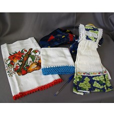 TRÊS PANOS DE PRATO, UM COM PINTURA DE UM CAJUEIRO E BICO DE CROCHÊ NA COR VERMELHA; OUTRO, LISO, COM BICO DE CROCHÊ NA COR AZUL; E O TERCEIRO, EM ALGODÃO CRU, COM BORDA EM TECIDO COM MOTIVOS DE FRUTAS (UVAS PRINCIPALMENTE), POSSUINDO ARGOLA EM MADEIRA E DETALHE EM MESMO TECIDO, ACOMPANHA INFORMATIVO COM NOME DA ARTESÂ E TELEFONE. UM CHINELO (TAM 39/40) EM TECIDO ATOALHADO NA COR AZUL, COM DETALHES EM VERMELHO E AMARELO, SOLA EMBORRACHADA.