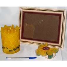 VELA DE GIRASSOL (9X12) NA COR AMARELA COM CRAVOS NA BASE. SACHÊ DE SABONETE (9,5X6X4 CM), FORRADO COM MEIA DE SEDA, TENDO, NA PARTE SUPERIOR, UMA FLOR AMARELA COM FOLHAS VERDES, EM MESMO MATERIAL. PORTA-RETRATO DE MESA (27,5X1 CM) EM MADEIRA, COM DETALHES VINHO E DOURADO.