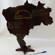 ESCULTURA NO FORMATO DO MAPA DO BRASIL (40X15X42,5 CM), FIXADA EM BASE NA FORMA DE ESTRELA. NA FRENTE, A INSCRIÇÃO 'FELIZ A NAÇÃO CUJO DEUS É O SENHOR / ... / MEU ILUSTRE PRESIDENTE ESTÁS COM O BRASIL NAS MÃOS, ENTREGUE AO SENHOR JESUS OS DESTINOS DA NAÇÃO, QUE TUDO SE AJEITARÁ E TERÁS SEU GALARDÃO. / SOU FEITO DE PAU-BRASIL QUE ESTÁ EM EXTINÇÃO, PEÇO SOCORRO AGORA PARA O CHEFE DA NAÇÃO, ME PLANTE EM TODOS OS ESTADOS COM UMA CANETA NA MÃO.'. ATRÁS, DIVISÃO DO MAPA COM AS SIGLAS DOS ESTADOS E 'AO EXMO. SR. LUIS INÁCIO LULA DA SILVA / PRES. DA REP. FED. DO BRASIL'. NO FUNDO DA BASE, 'JOÃO EVANGELISTA GOMES / BARRA DO GARCAS / MT / 07-09-2004'.