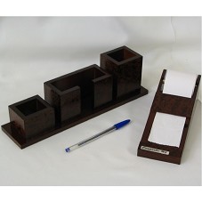 CONJUNTO PARA ESCRITÓRIO COMPOSTO POR: UM PORTA CANETA/CLIPS/PAPEL (31X7,5X9 CM) EM MADEIRA ESCURA, COM DETALHES RAJADOS; E UM PORTA-RECADO EM BOBINA DE PAPEL COM BASE EM MESMA MADEIRA (22X7,5X6,3 CM), POSSUINDO ORIFÍCIO PARA CANETA. AMBOS POSSUEM A ETIQUETA 'CAMPANHA-MG' E 'BA / ARTESANATO BARRACÃO'.