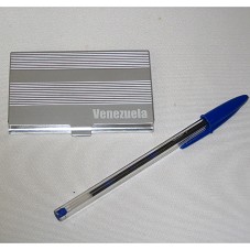 PORTA CARTÃO DE VISITAS (9,5X6X0,5 CM) EM ALUMÍNIO FOSCO, COM A INSCRIÇÃO 'VENEZUELA'. ACONDICIONADO EM EMBALAGEM (10X6,5X1 CM) DE PAPELÃO PRETO.