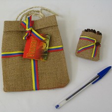 SACOLA (13,5X16,5 CM) EM JUTA, COM ALÇA EM CORDÃO DE SISAL, POSSUINDO FITA NAS CORES AMARELA, AZUL E VERMELHA E CARTÃO 'VENEZUELA' SOBRE A 'RUTA DE LOS LIBERTADORES'. ACOMPANHA UM IMÃ DE GELADEIRA (5X7,5 CM) EM FORMATO DE UM SACO DE JUTA, COM GRÃOS DE CAFÉ E MESMA FITA.