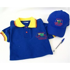 CAMISA GOLA PÓLO (TAM M) NA COR AZUL, COM COLARINHO E DETALHES DAS MANGAS EM AMARELO E VERMELHO. NA FRENTE, BORDADO EM VERMELHO, 'MUNICIPIO ALBERTO ARVELO TORREALBA / SABANETA BARINAS'; E DESENHO DE UMA ÁRVORE EM FRENTE A TRÊS RISCOS NAS CORES AMARELO, AZUL E VERMELHO. ACOMPANHA BONÉ EM BRIM AZUL, COM MESMO BORDADO E INSCRIÇÃO, ALÉM DE 'HASTA LA VICTORIA SIEMPRE'.