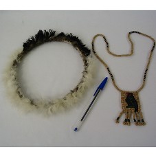 COCAR INDÍGENA, CIRCULAR, TIPO AURÉOLA, COM PENAS BRANCAS E PRETAS. COLAR COM PINGENTE RETANGULAR EM SEMENTES, SENDO ALGUMAS PINTADAS DE PRETO. NO PINGENTE, PINTURA EM PRETO, VERDE E VERMELHO.