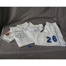 CONJUNTO DE CAMISA E SHORT DE FUTEBOL (TAM NÃO ESPECIFICADO) EM TECIDO BRANCO, COM FRISO AZUL NAS LATERAIS. POSSUEM O NÚMERO '26'; E, NA CAMISA, BORDADO EM AZUL, 'ASSOCIAÇÃO BENEFICENTE CLUBE DA PAZ / ABCPAZ'.