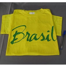CAMISETA EM MALHA AMARELA, DE MANGA CURTA. NA FRENTE, EM VERDE, 'BRASIL'. ATRÁS, 'EMBRATUR / MINISTERIO DO TURISMO / BRASIL UNA NACIÓN DE TODOS'.
