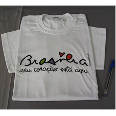 CAMISETA EM MALHA BRANCA (TAM G), DE MANGA CURTA. NA FRENTE, EM PRETO, VERDE, LILÁS E VERMELHO, 'BRASÍLIA SEU CORAÇÃO ESTÁ AQUI'. ATRÁS, LOGOMARCAS E NOMES DE INSTITUIÇÕES.