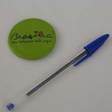 BÓTON EM METAL, COM FRENTE DE FUNDO VERDE E INSCRIÇÃO EM PRETO 'BRASÍLIA SEU CORAÇÃO ESTÁ AQUI'.