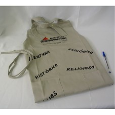 AVENTAL (TAM P) EM BRIM OCRE, COM DOIS BOLSOS FRONTAIS. NA FRENTE, 'MINAS GERAIS / GOVERNO DO ESTADO / TURISMO / CONSTRUINDO UM NOVO TEMPO'. POSSUI DIVERSAS PALAVRAS ESTAMPADAS, DE FORMA SOLTA, NA FRENTE, 'AVENTURA / ECOLÓGICO / HISTÓRICO / RELIGIOSO / ...'.