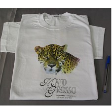 CAMISETA EM MALHA BRANC (TAM G),, DE MANGA CURTA. NA FRENTE, ESTAMPA COM FOTO DE UMA ONÇA E, 'MATO GROSSO / TURISMO: EMOÇÃO EM TODOS OS SENTIDOS'. ATRÁS, LOGOMARCAS DAS INSTITUIÇÕES DE APOIO.