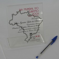 PLACA EM ACRÍLICO (13X15X6,5 CM),TRAZENDO O CONTORNO DO MAPA DO BRASIL E A INSCRIÇÃO 'DIA MUNDIAL DO TURISMO 2004 / 27 DE SETEMBRO / HOMENAGEM A LUIZ IGNÁCIO LULA DA SILVA, EXCELENTÍSSIMO SENHOR PRESIDENTE DA REPÚBLICA FEDERATIVA DO BRASIL, PELOS SERVIÇOS PRESTADOS E A DEDICAÇÃO AO DESENVOLVIMENTO DO TURISMO BRASILEIRO. / COMISSÃO DE TURISMO E DESPORTO / ONGTUR / .... / BRASÍLIA-DF'.