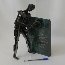 ESCULTURA EM SUCATA DE FERRO (14X15X33 CM), MOSTRANDO UMA FIGURA HUMANA TRABALHANDO EM MAQUINARIA, COM CHAVE DE BOCA EM UMA DAS MÃOS. FIXADA EM PLACA VERTICAL (17X24,5 CM) COM A INSCRIÇÃO 'AO PRESIDENTE LUIS INACIO LULA DA SILVA / QUANDO A NAÇÃO TEM LÍDERES INTELIGENTES E SENSATOS, ELA SE TORNA FORTE E FIRME... / PROVÉRBIOS 28:2 / COM ADMIRAÇÃO / SERGIO CANALE / 20/10/2004'.