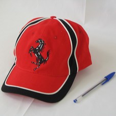 BONÉ EM BRIM VERMELHO, COM DETALHES EM PRETO E BRANCO. NA FRENTE, FIGURA DE UM CAVALO EMPINADO, BORDADO EM PRETO E BRANCO. ATRÁS, 'FERRARI'.