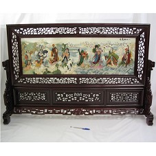 BIOMBO CHINÊS (116X32X77 CM), DE PORTE BAIXO, EM MADEIRA LAQUEADA, EM TONALIDADE VINHO, COM DESENHOS ESCULPIDOS. EMOLDURA BORDADO (88,5X28,8 CM) EM TECIDO FINO, MOSTRANDO HOMENS E MULHERES, VESTIDOS TIPICAMENTE, NUM LOCAL CERCADO DE VEGETAÇÃO E GARÇAS. POSSUI IDEOGRAMAS CHINESES NA PARTE SUPERIOR.