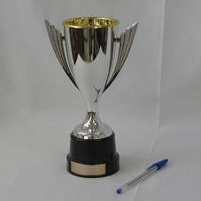 TAÇA (15X9X24,5 CM), ESTILO TROFÉU, EM PLÁSTICO PRATEADO COM DOIS ORNAMENTOS NAS LATERAIS, LEMBRANDO ASAS; E, INTERNAMENTE, DOURADA. BASE CIRCULAR ESCALONADA, EM PLÁSTICO PRETO, COM PLACA EM METAL POSSUINDO A GRAVAÇÃO 'PRESIDENTE LULA VOCÊ É GRANDE COMO O BRASIL!'.