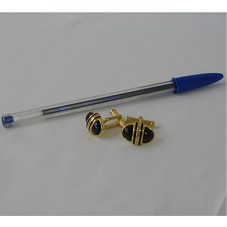 UM PAR DE ABOTOADURAS, EM METAL DOURADO, COM PEDRA PRETA OVALADA NA PARTE SUPERIOR E A INSCRIÇÃO 'MONTBLANC'. ACONDICIONADO EM ESTOJO PRETO (8X8X3,5 CM).