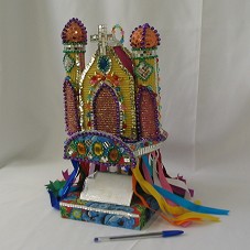 ARTESANATO (19X16X35 CM) MOSTRANDO O PRÉDIO DE UMA IGREJA, CONFECCIONADO EM PAPELÃO MICROONDULADO NAS CORES AMARELA E ROSA, E DECORADA COM LANTEJOULAS, MIÇANGAS, ESPELHOS E PURPURINA. NAS TORRES, DUAS CÚPULAS OGIVAIS. FIXADA EM BASE FORRADA DE TECIDO AZUL FLORAL, COM MESMA DECORAÇÃO, POSSUINDO FITAS COLORIDAS DE CETIM AO LONGO DO SEU PERÍMETRO. SUSTENTADA POR TUBO DE ALUMÍNIO PRESO A OUTRA BASE, ONDE HÁ UMA PLACA (10X6 CM) COM A GRAVAÇÃO 'AO PRESIDENTE LULA, NOSSA HOMENAGEM ATRAVÉS DA COROA DO GUERREIRO, SÍMBOLO MAIOR DA CULTURA POPULAR ALAGOANA. UNIVERSIDADE FEDERAL DE ALAGOAS / MACEIÓ, OUTUBRO DE 2004'.