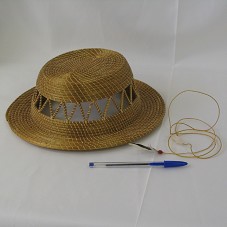 CHAPÉU (29X28X9,5 CM) CONFECCIONADO EM CAPIM DOURADO, COM DESENHO GEOMÉTRICO FORMANDO UMA ABERTURA DE CHEIOS E VAZIOS. ACOMPANHA CORDÃO COM DUAS PENAS NAS EXTREMIDADES E UMA SEMENTE VERMELHA JUNTO COM UMA DELAS.