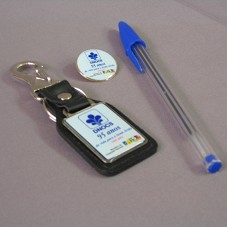 BÓTON (2,5 CM) EM METAL DOURADO, COM FUNDO AZUL E INSCRIÇÃO 'DNOCS 95 ANOS DE VIDA PARA O SEMI ÁRIDO 1909-2004'. CHAVEIRO (3,5X11 CM)EM METAL PRATEADO E COURO PRETO, COM PLACA METÁLICA CONTENDO A MESMA INSCRIÇÃO DO BÓTON.